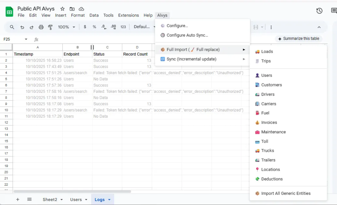 Quickly connect your Alvys account and import live operational data — Loads, Trips, Customers, Drivers, Carriers, Invoices, and more — directly into Google Sheets. No coding or manual exports required.