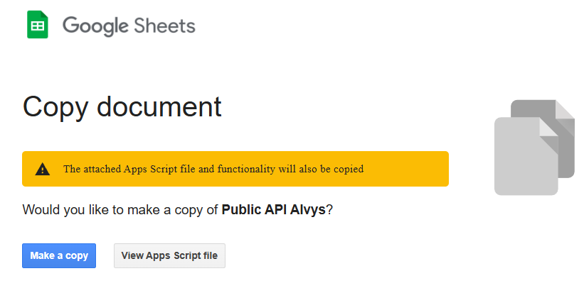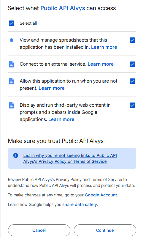 Make a Copy in Google Drive. The first time you open it, Google Sheets will ask you to grant permissions. Click Continue → Allow all — this enables the secure connection to the Alvys Public API. You may need to reload the file once after granting access.